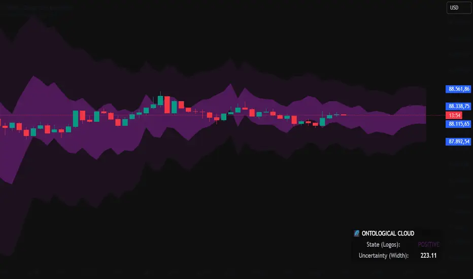 The Ontological Cloud is a forward-projecting volatility bands system based on the philosophy of "Universal Potential" ($\Psi_U$). Unlike standard Bollinger Bands or Keltner Channels, this indicator adjusts its width based on the Probability Strength of the market state.