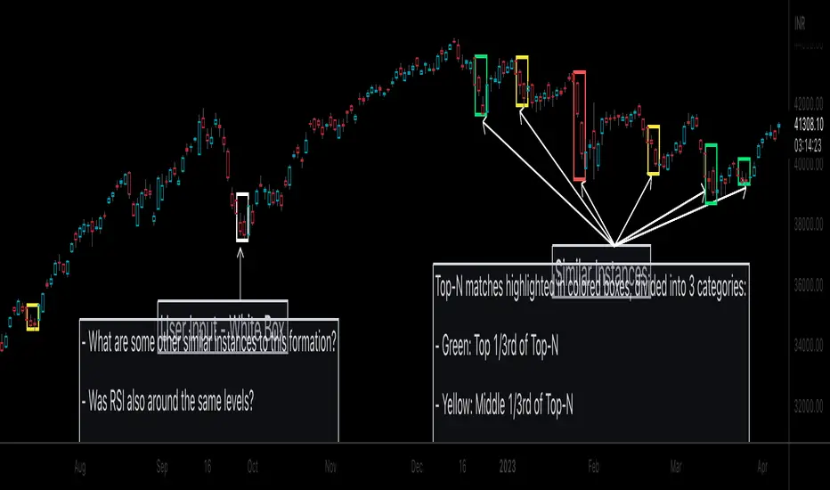 This tool analyses bars selected by the user, and highlights bar clusters on the chart that exhibit similar behaviour across multiple dimensions. It can detect a single candle pattern like hammers or dojis, or it can handle multiple candles like morning/evening stars or double tops/bottoms, and many more. In fact, the tool is completely independent of such specific candle formations, instead, it works on the idea of vector similarity and generates a degree of similarity for every single combination of candles. Only the top-n matches are highlighted, users get to choose which patterns they want to analyse and to what degree, by customising the feature-space.