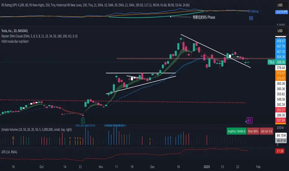 熟悉我图表的朋友们可能会看到,我在股价的上方有一个指标,里面有一根蓝线,一根黄线。这根蓝线就是标的的RS Line(相对势能线),而黄线就是蓝线的21DEMA。