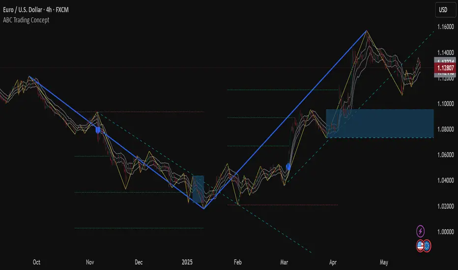 ABC Trading Concept is a wave- and trend-based market structure indicator that identifies shifts in price behavior by analyzing impulse and correction patterns. It introduces a unique calculation method—Price-MAD-ATR Bands—to detect wave formation, trend reversals, and potential trade zones with dynamic adaptability to volatility and trend strength.