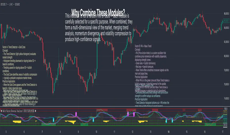Multi-Factor Reversal Analyzer is a comprehensive technical analysis toolkit designed to detect market tops and bottoms with high precision. It combines trend momentum analysis, price action behavior, wave oscillation structure, and volatility breakout potential into one unified indicator.