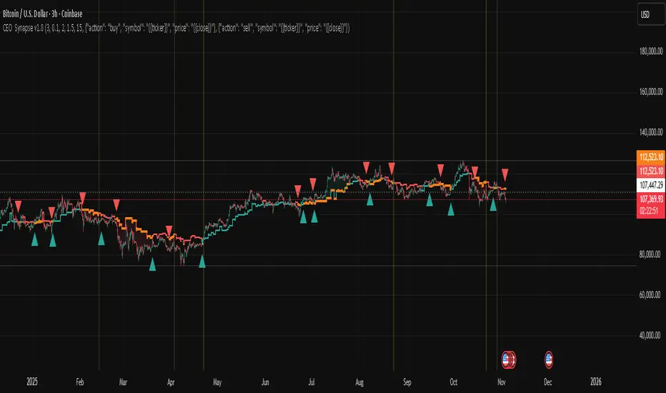 Fully Compatible Automation (JSON): The strategy outputs fully configurable JSON-formatted alert messages for buy, sell, and close actions. This allows connecting CEO Synapse signals to automation platforms like 3Commas and PineConnector for fully automated trading. Dynamic values like position size ({{strategy.order.contracts}}) are automatically included in alerts.