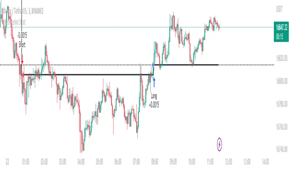 This strategy uses Renko, it generates a signal when there is a reversal in Renko. When using historical data, it provides a good entry and an okay exit. However, in a real-time environment, this strategy is subject to repaint and may produce a false signal.