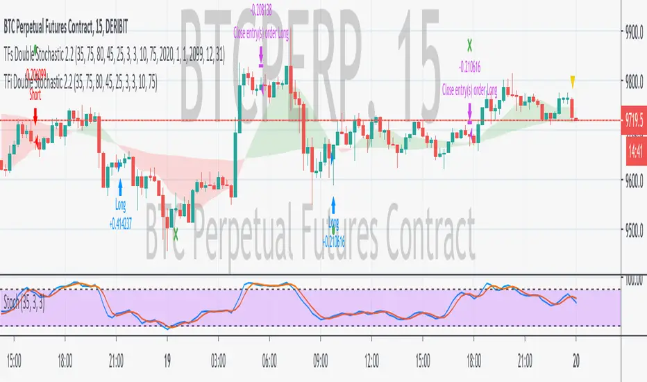 The entry and exit points are visualized in the chart via green arrows and crosses; the position follows the exact behavior of the strategy script.