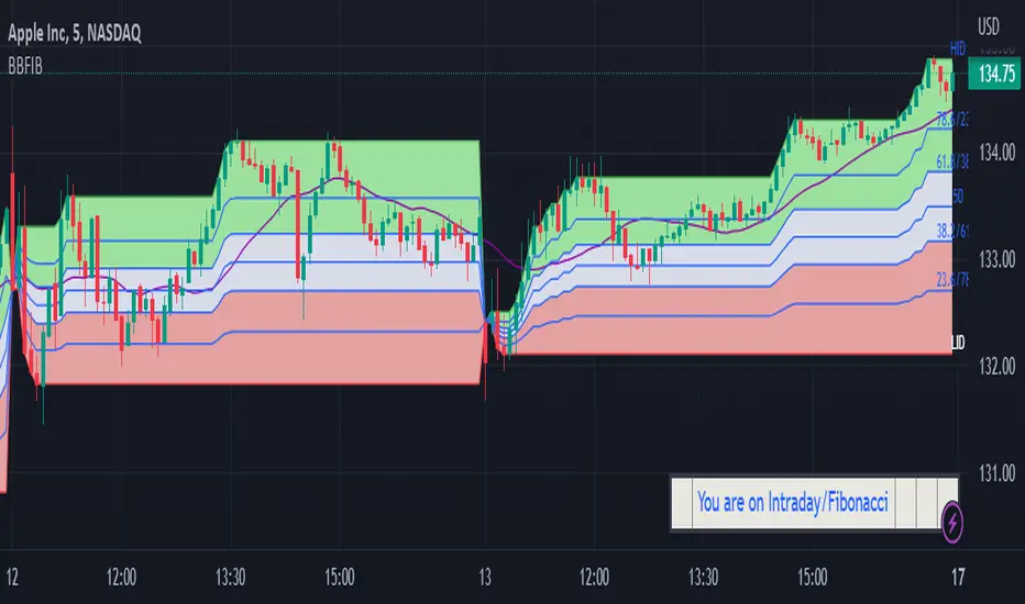 Regular /Intraday Bollinger Bands and Fibonacci Levels Indicator displays Fibonacci levels for Intraday and Regular ( for given number of bars) for Bollinger Bands and for Highest and Lowest levels on Chart .
