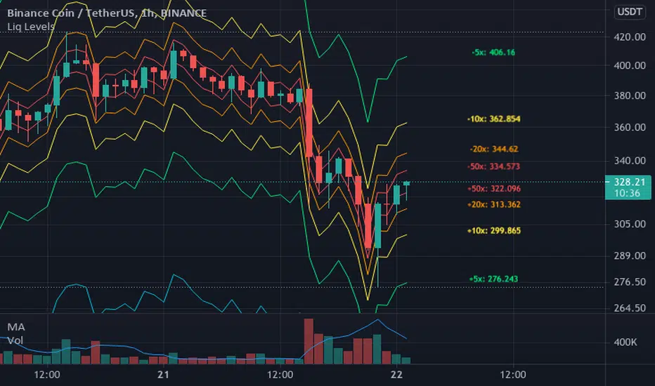 It tracks and displays the liquidation price for 5 customisable leverage levels and plots them either historically and/or in real time, with labels beside each including the estimated price.