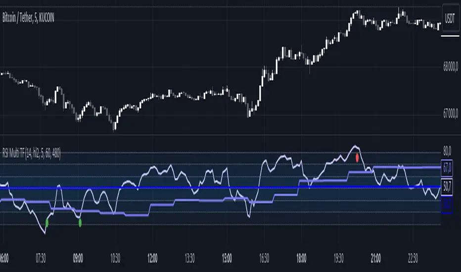 The RSI Multiple TimeFrame script is designed to enhance trading decisions by providing a comprehensive view of the Relative Strength Index (RSI) across multiple timeframes. This tool helps traders identify overbought and oversold conditions more accurately by analyzing RSI values on different intervals simultaneously. This is particularly useful for traders who employ multi-timeframe analysis to confirm signals and make more informed trading decisions.