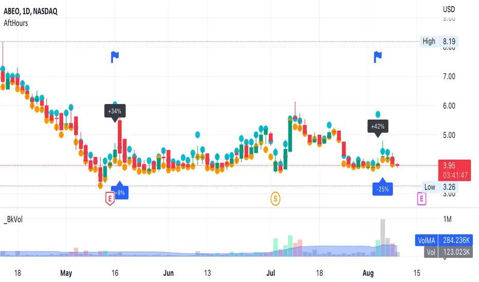 The script pulls Lower Timeframe (30min) data to draw High/Low of Out-of-hours/AfterHours session (post-market session & next day pre-market session) on the Daily regular session chart. It then identifies significant AfterHours price changes and what happens to these price Spikes by the Open of the next day regular session.