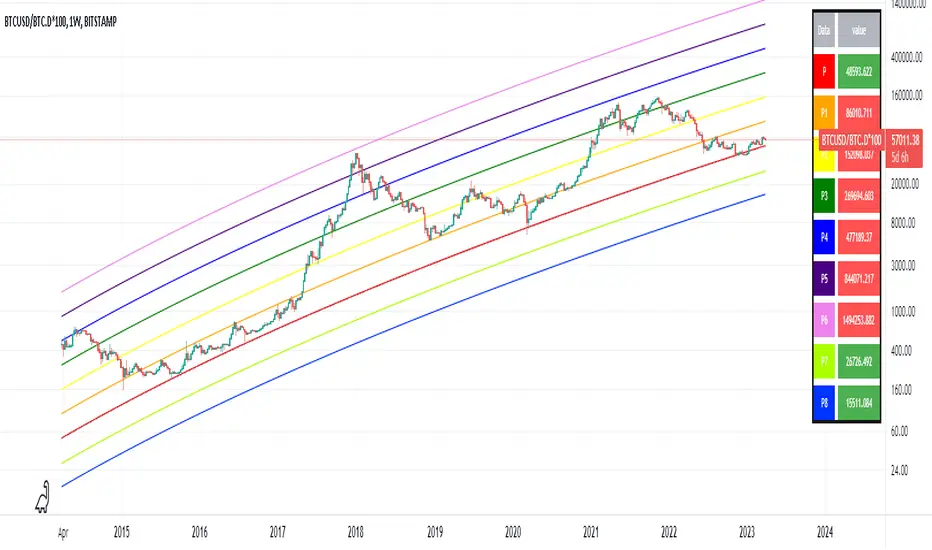 I'd like to share with you a handy tool that is incredibly useful for analyzing Bitcoin's price movements. This optimized logarithmic curve indicator is a refined version of the popular "My BTC log curve" indicator, originally created by @quantadelic.