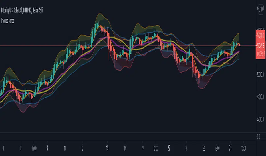 The Bollinger Bands remain visible as the yellow interior clouds on the top cloud and the blue interior clouds on the bottom cloud. Often, the thicker the yellow or blue cloud is, the less severe a throwback from a given trend reversal will be. Often the thinner that yellow or blue cloud is, the more severe the trend reversal will be. If price is rising into a thin interior yellow cloud, the following dip will be substantial. If price action dips towards a thicker interior blue cloud, often the pump following that dump will be less enthusiastic.