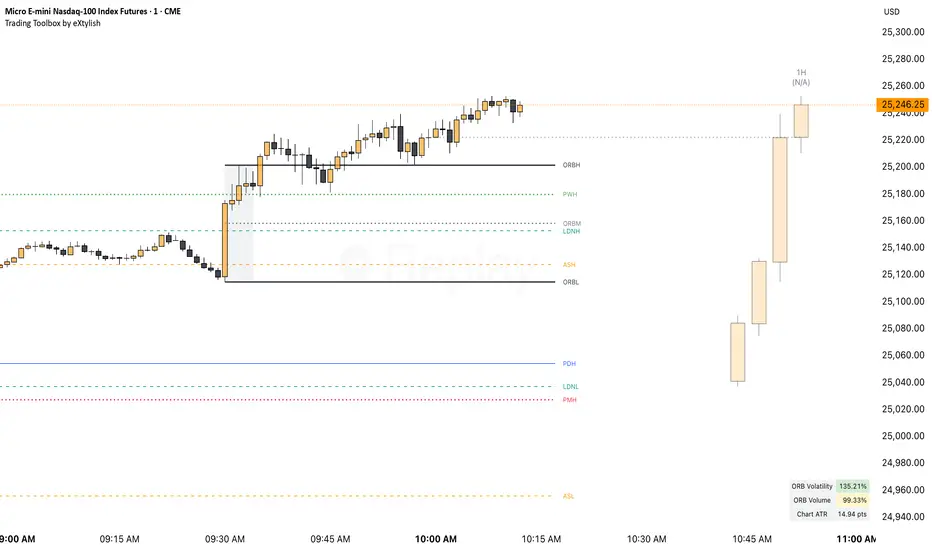 Opening Range (ORB): It plots an opening range (e.g., first 5 mins) and includes an advanced Info Box that analyzes whether the opening's volatility and volume are high or low compared to average.