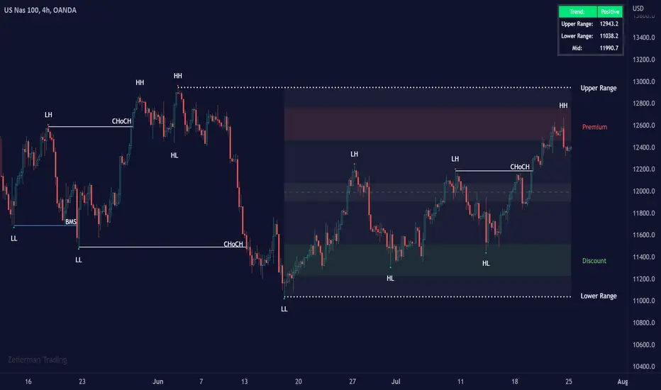 - Use the indicator to identify the current range and premium and discount levels.