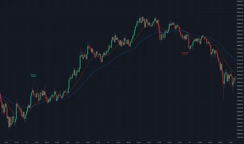 This script uses two Exponential Moving Averages (EMAs) to find price uptrends and downtrends. An Exponential Moving Average (EMA) is a type of moving average that places a greater weight and significance on the most recent data points. The script produces uptrend and downtrend signals based on crossovers and divergences between the two EMAs, the user will be able to spot a trend change (when the EMAs crossover) and to determine the strength of the current trend (when the EMAs diverge). It is also posible to get alerts for uptrends and downtrends on the web and mobile app with sound and pop-ups as well as via email. The optimal time to enter and exit the market can be concluded from this trend changes.