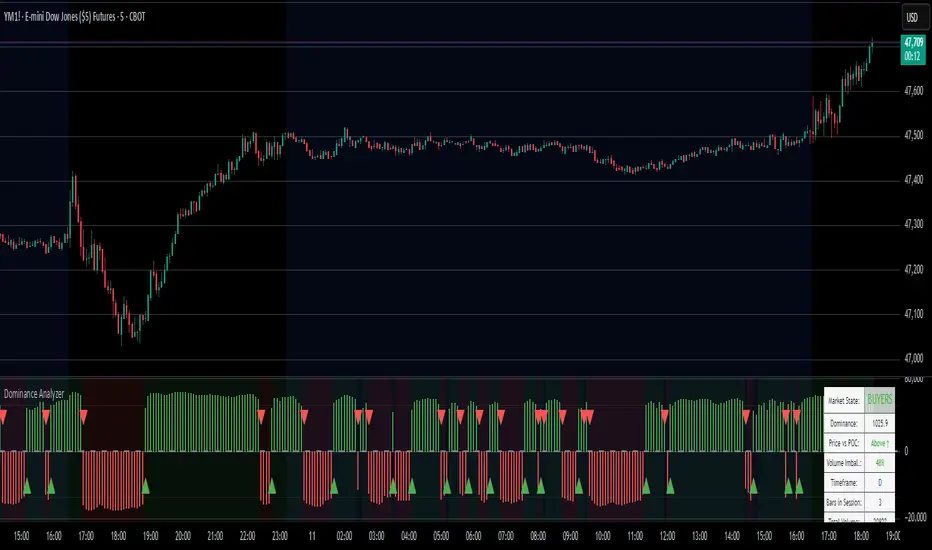 - **Histogram**: Shows smoothed dominance score (green = buyers, red = sellers)