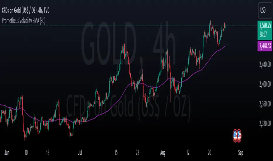 The Prometheus Volatility EMA is an indicator that calculates an Exponential Moving Average with the historical volatility as how we decide how sensitive to make the indicator to the most recent data.