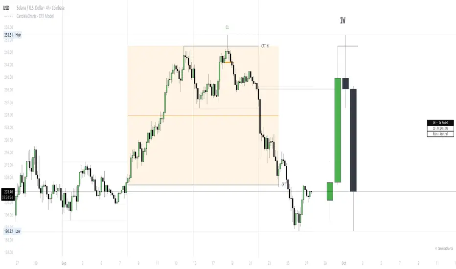 Candle Range Theory (CRT) is a framework that treats every candle as a tradable range. A candle defines high/low, the next candle often sweeps one side (manipulation), reclaims back inside, and distributes toward the opposite side with 50% of the range as a common first target.