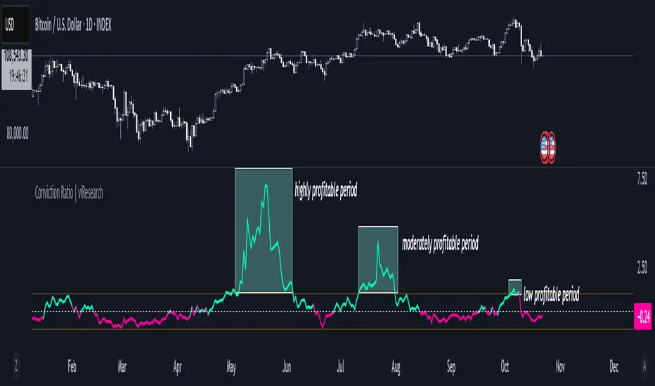 The Conviction Ratio by viResearch is a trend strength indicator designed to measure the conviction behind market movements by analyzing price returns over a defined period. It reflects how consistently and powerfully an asset has trended within that time window. The higher the ratio, the stronger and more confident the trend.