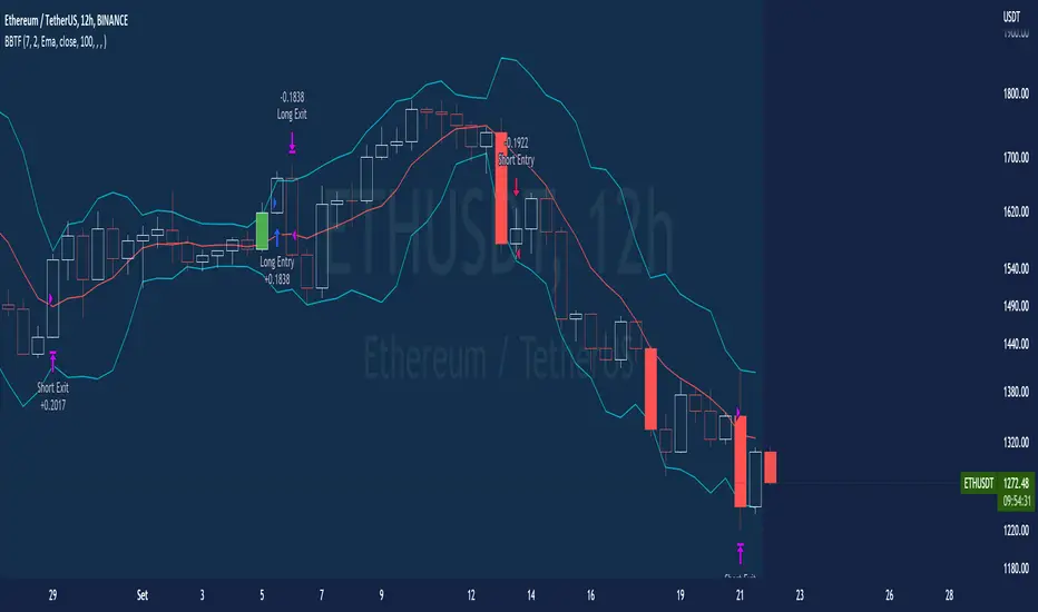 script uses Bollinger Bands to indicate the start of a trend, entry is set when price opens below and closes above the upper band or for short when price opens above and closes below the lower band.