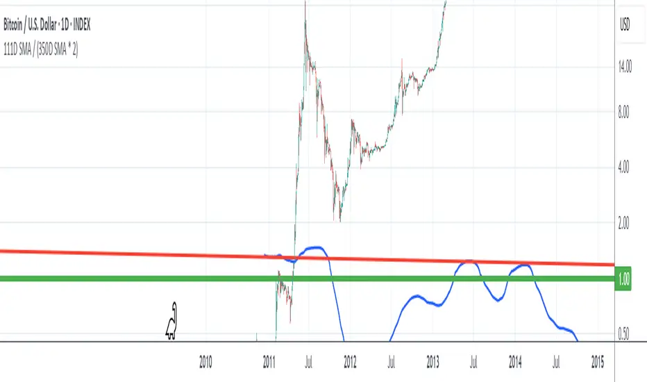 This custom technical indicator calculates a ratio between two moving averages that are used for the PI Cycle Top indicator. The PI Cycle Top indicator triggers when the 111-day simple moving average (111D SMA) crosses up with the 350-day simple moving average (350D SMA *2).