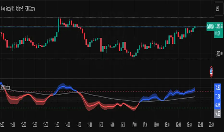 The RSI Ribbon Strategy is an advanced momentum-based trading system that enhances the traditional RSI indicator by using multiple RSI periods simultaneously. This creates a visual "ribbon" effect that helps traders identify trend strength, momentum shifts, and high-probability entry/exit points.