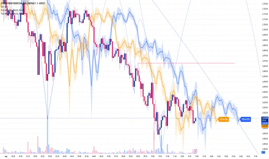Advanced FLD (Future Lines of Demarcation) indicator with area visualization for cycle analysis. Projects price levels into the future by half the cycle period, displaying high, low, and median as colored areas.