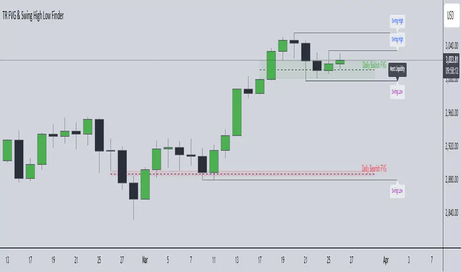 The TR FVG & Swing Level Finder is a powerful Pine Script indicator designed for traders who want to identify Fair Value Gaps (FVGs) and Swing Highs/Lows on their charts. This indicator combines two essential technical analysis tools into one, helping traders spot potential areas of support, resistance, and trend reversals. FVGs are price gaps that often act as areas of interest for price to return to, while swing highs and lows help identify key turning points in the market. The indicator is highly customizable, allowing users to adjust colors, limits, and display options to suit their trading style.