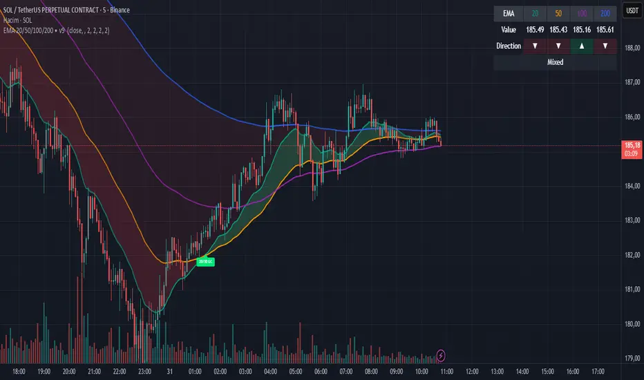 A compact top-right panel displays each EMA’s current value, slope direction, and overall trend alignment status (BULL / BEAR / MIXED).