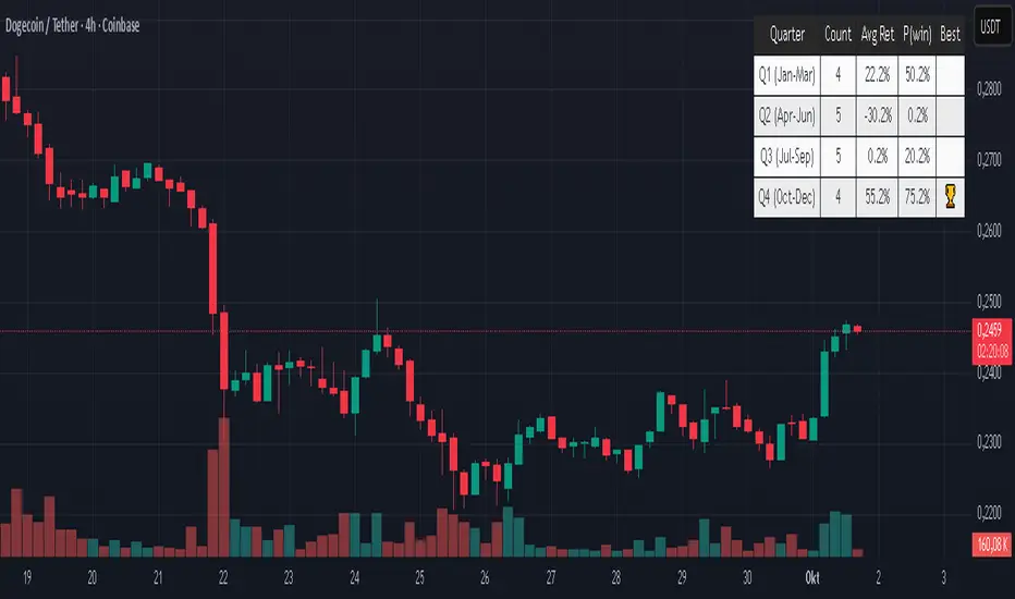 This indicator builds a compact table that summarizes quarterly seasonality from three-month bars. It aggregates the simple return of each historical quarter, counts observations, computes the average return and the win rate for each quarter, and flags the historically strongest quarter. The output is a five-column table rendered on the chart, designed for quick comparison rather than signal generation. Because it processes only confirmed higher-timeframe bars, results are stable once a quarter has closed.