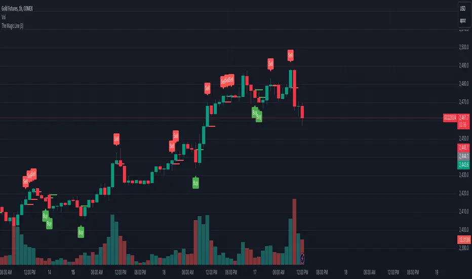 Ex: If there are 3 green (bullish) candles print in a row, a 'sell' signal will print, and the entry line will be one tick below the open of the previous green candle. You can use that line as your entry.