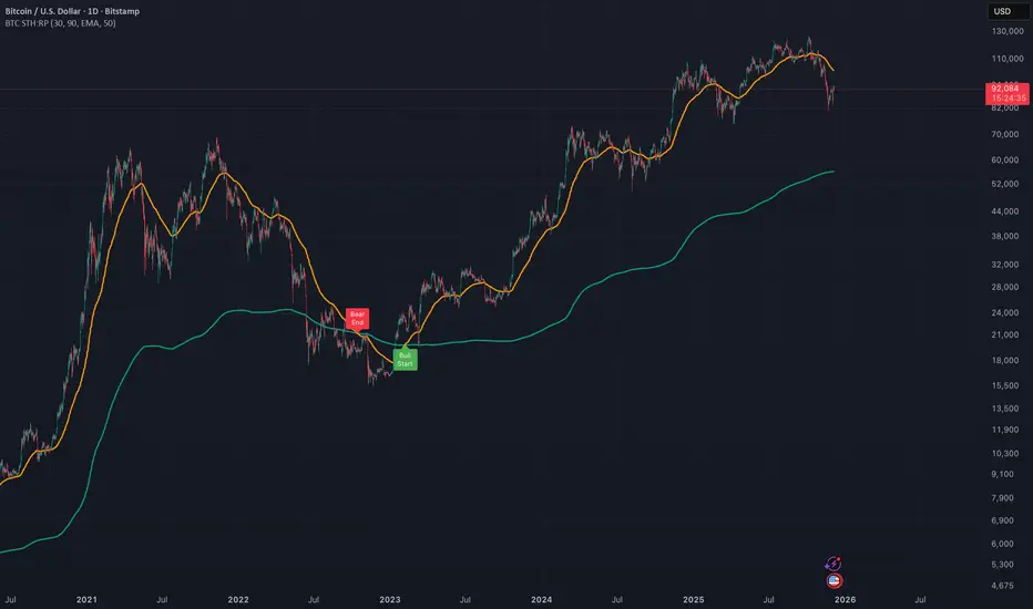 Indicator that builds a Short-Term Holder (STH) price proxy using a configurable moving average of Bitcoin’s market price and compares it to Bitcoin’s Realized Price (RP) derived from on-chain data.