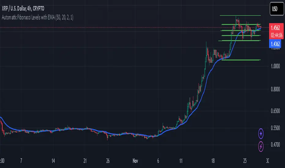 The Fibonacci levels are dynamically colored to reflect the trend direction, determined by the position of the price relative to the Exponential Moving Average (EMA). When the market is in an uptrend (price above EMA), Fibonacci levels are displayed in green, and in a downtrend (price below EMA), they are shown in red. This color coding helps traders quickly identify the current market direction.