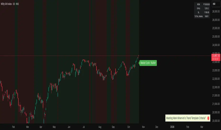 This indicator provides a clear visual guide to market cycles for any asset or index you trade. It highlights bullish and bearish phases, helping you better manage your risk. By knowing the current market cycle at a glance, you can decide when to increase your exposure and when to be more cautious. Simply paste it on the chart of any script (Preferably INDEX's, I use CNX500)