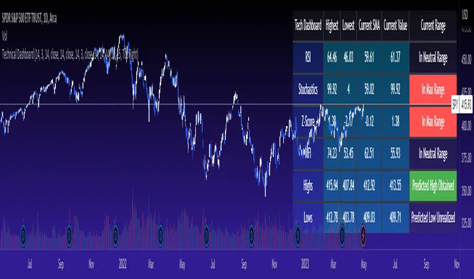 The technical dashboard displays 4 commonly used technical indicators: Stochastics, RSI, Z-Score and MFI. It will display the current value of each of these technical indicators, as well as the highest and lowest value over a user defined period and the SMA.