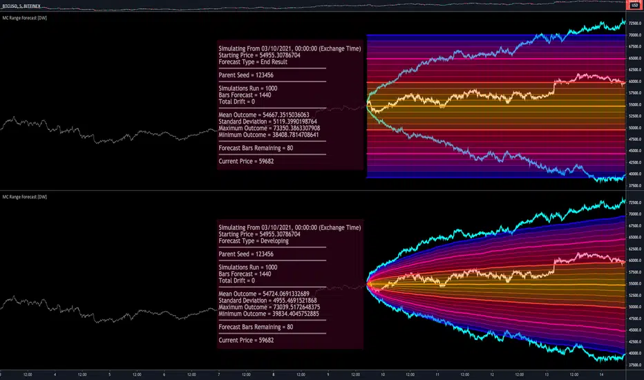 An information panel is also displayed at the starting time which shows the starting time and price, forecast type, parent seed value, simulations run, forecast bars, total drift, mean, standard deviation, max outcome, min outcome, and bars remaining.