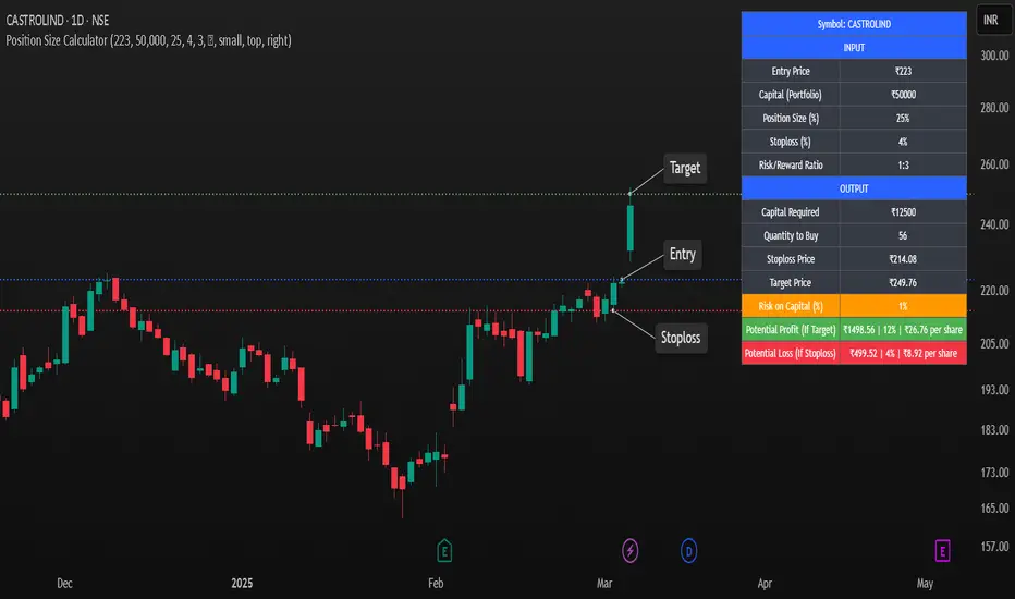 ✅ Automatic Position Sizing: Calculates the capital required, quantity to buy, stop-loss, and target price dynamically.
