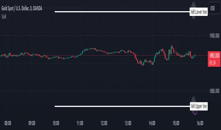 The Value at Risk Channel (VaR Channel) is a trading indicator designed to assist traders in managing their risk exposure effectively. By allowing users to select a specific time period and a probability value, this indicator generates upper and lower limits that the price might potentially attain within the chosen timeframe and probability range.