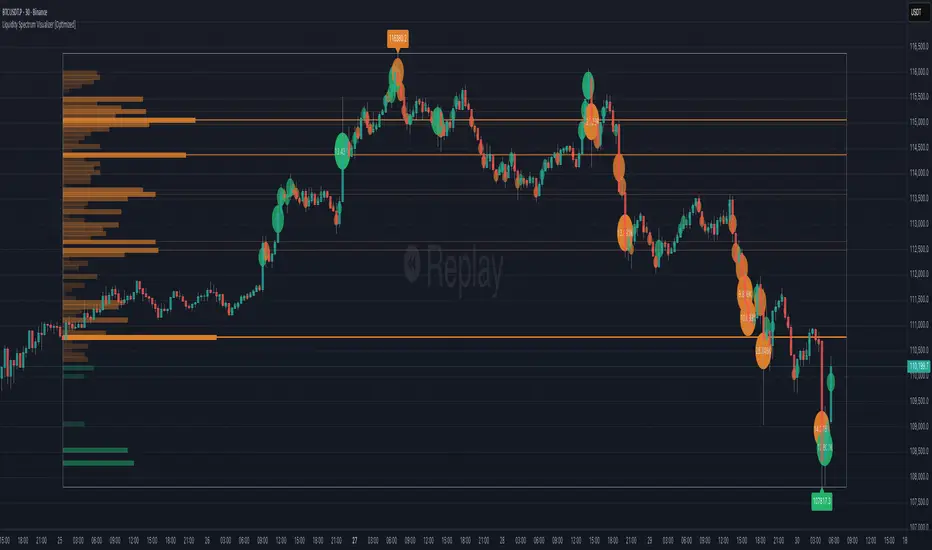 The script preserves the original visualization and logic — it still maps volume activity across price bins to highlight liquidity clusters — but the internal calculations have been carefully restructured to reduce computational load and improve responsiveness on live charts.