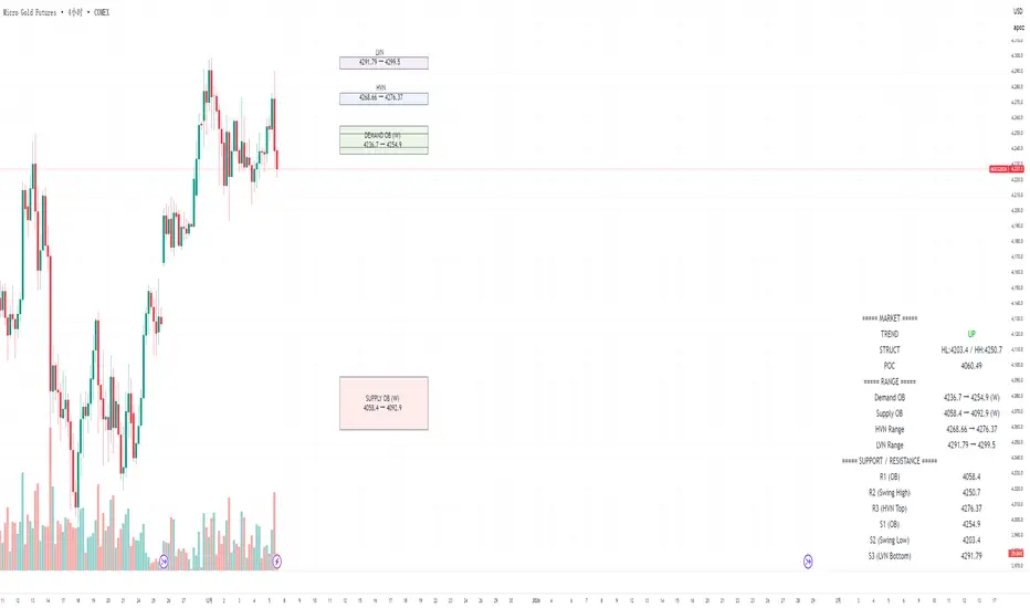 GOLD 4H HUD v8.9 is a clean, structured Smart Money Concepts (SMC)–based analysis tool designed exclusively for XAUUSD on the 4-hour timeframe.