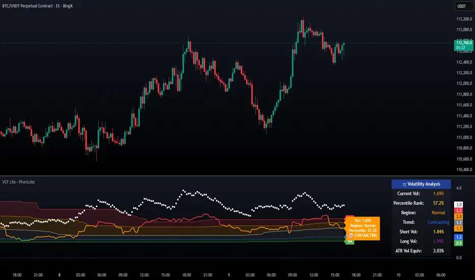 - On-Chart Labels: Clear labels automatically display the current volatility reading, its percentile rank, the detected regime, and trend (Expanding/Contracting).