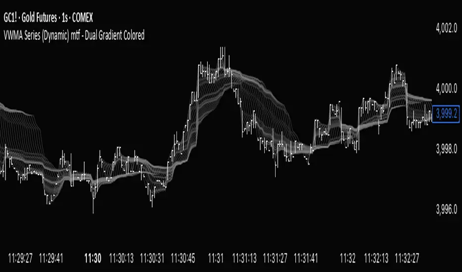 "VWMA Series (Dynamic) mtf - Dual Gradient Colored" is a multi-timeframe (MTF) Volume-Weighted Moving Average (VWMA) ribbon indicator that plots up to 60 sequential VWMAs with arithmetic progression periods (e.g., 1, 4, 7, 10…). Each VWMA line is dual-gradient colored: Base hue = Greenish (#2dd204) if close > VWMA (bullish), Magenta (#ff00c8) if close < VWMA (bearish)