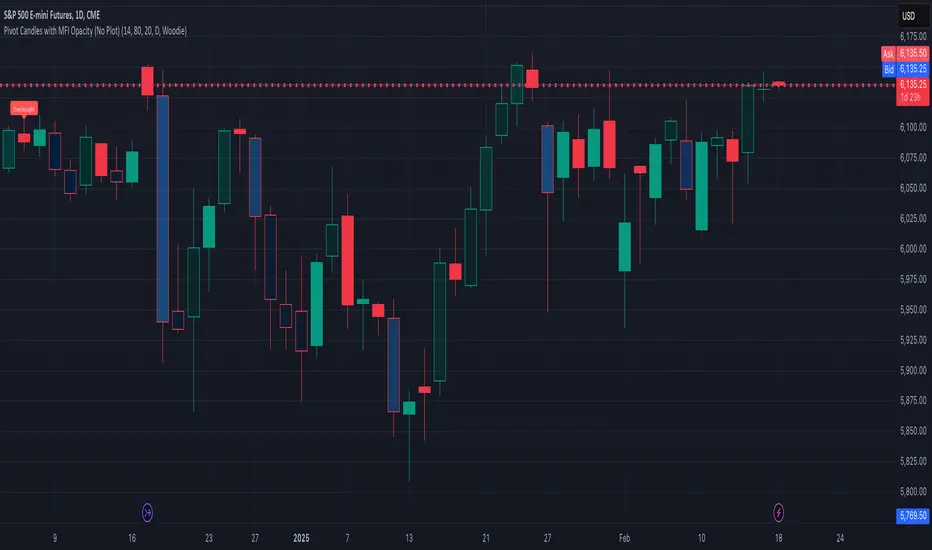 The Money Flow Index (MFI) in this indicator not only provides overbought/oversold alerts but also controls the opacity of your candlesticks. When MFI readings are high, the candles become more opaque, indicating strong buying pressure. Conversely, lower MFI values lead to more transparent candles, suggesting reduced momentum.