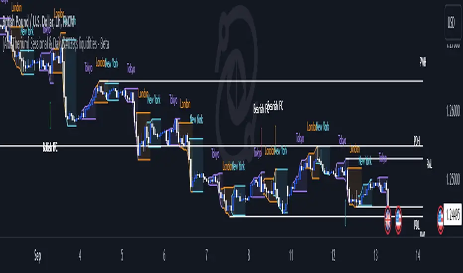The [AlbaTherium] Sessional & Daily Liquidities - Beta indicator, centered around the Institutional Funding Candle (IFC), stands as a potent tool for traders, offering them the means to spot critical inflection points in the market. By understanding the role of the IFC in violating significant swing highs or lows and major session highs or lows, traders can make informed decisions and seize opportunities within the ever-evolving realm of financial markets. It's crucial to note that while IFC candle colors can provide insights, they do not unilaterally dictate market direction. Furthermore, candle closure can be a valuable consideration in specific situations, particularly when evaluating other High Time Frame POIs.