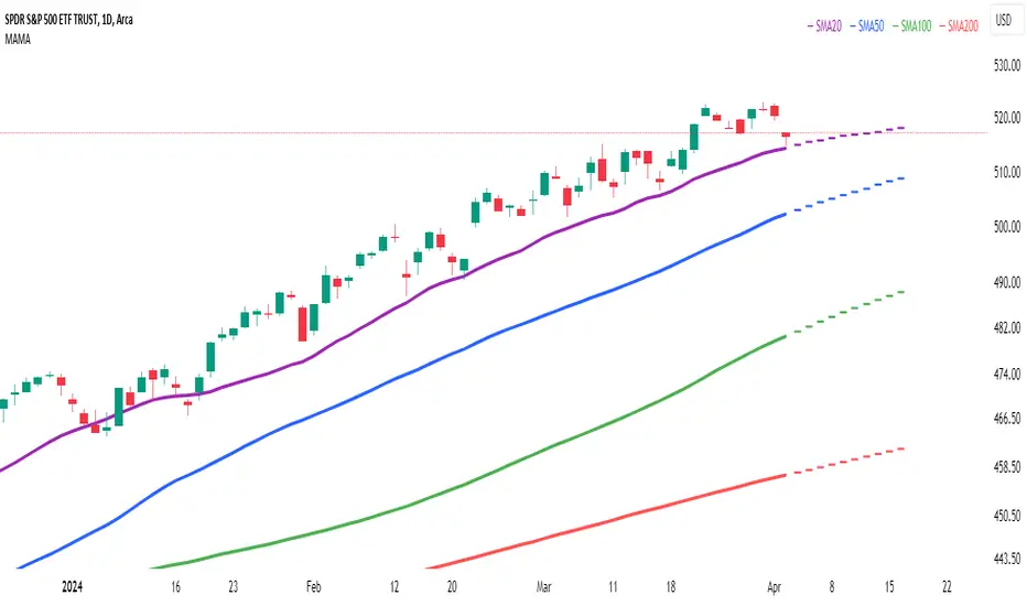 The Multi Adaptive Moving Average (MAMA) indicator is an advanced tool for technical analysis, designed to provide traders with a detailed understanding of market trends and potential future price movements. This indicator utilizes multiple Simple Moving Averages (SMAs) and forecasting techniques to enhance decision-making processes.