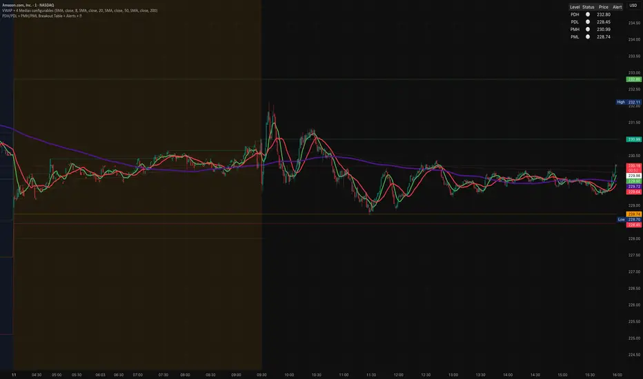 This indicator displays a real-time breakout dashboard for PDH/PDL and PMH/PML levels, including alerts and visual status markers. It automatically tracks the previous day's high/low and the current pre-market high/low, updating the table dynamically as price interacts with each level. The latest update adds row-visibility options, allowing users to hide or display PDH, PDL, PMH, and PML rows individually for a cleaner and more customized layout.Информация о релизе