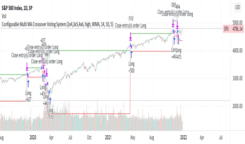 This strategy goes long when all fast moving averages that you have defined are above their counterpart slow moving averages.