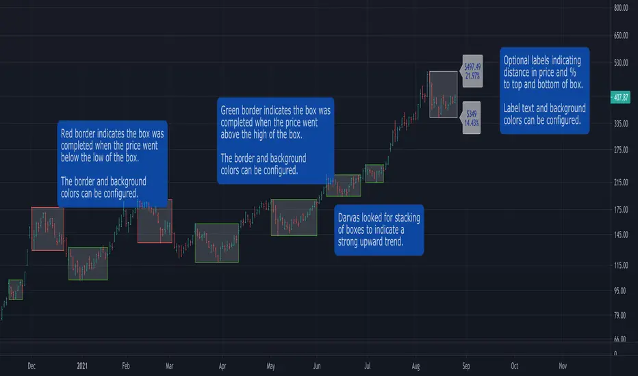 The Darvas box theory is based on the work of Nicolas Darvas, author of the book "How I Made $2 Million in the Stock Market". This indicator uses his box theory to help visualize upward trends and find potential opportunities to buy or add to a position.