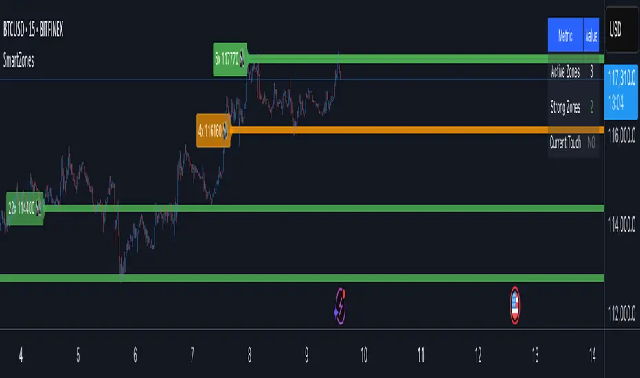 - Active Zones: Current qualified S/R levels (3+ touches)