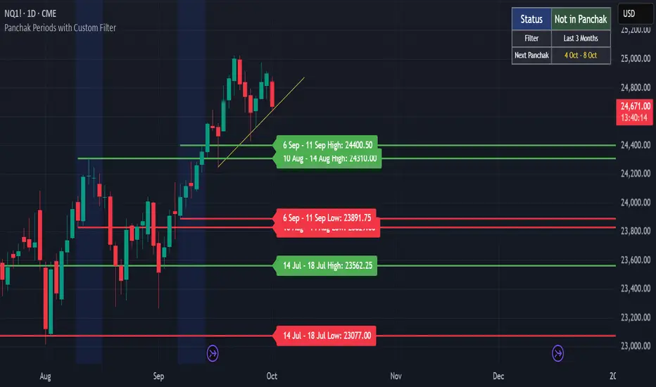 This indicator identifies and marks Panchak periods (inauspicious 5-day periods in Vedic astrology) on your trading charts, displaying the high and low price levels achieved during each period.