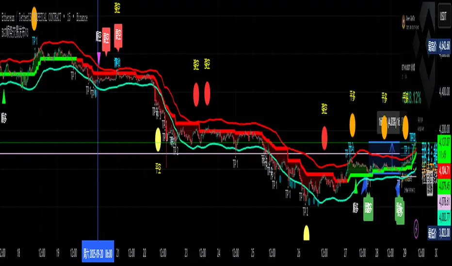 The indicator creates a multi-layered trading system that identifies trend direction, entry/exit points, and manages risk through automated take-profit and stop-loss levels. It integrates trend-following algorithms with momentum oscillators and volatility-based filters to generate high-probability trading opportunities.