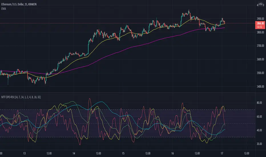 This indicator uses the principle of taking the RSI of DPO readings across multiple time frames in order to provide trade signals and an overarching view of market conditions to the trader. My hope with creating this indicator was to present more divergence based signals than your typical indicator, while still keeping those signals at a high quality.